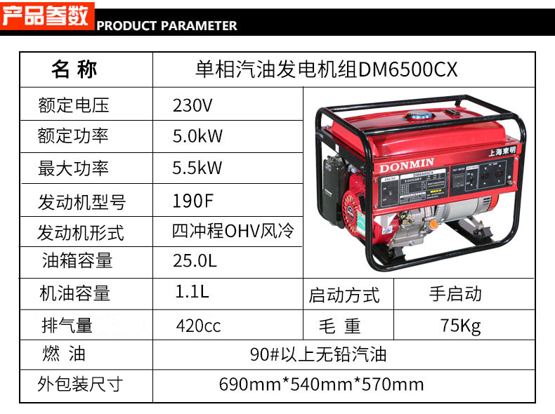 * 表示必填采購:單相 5kW小型汽油發(fā)電機組 DM6500CX手動