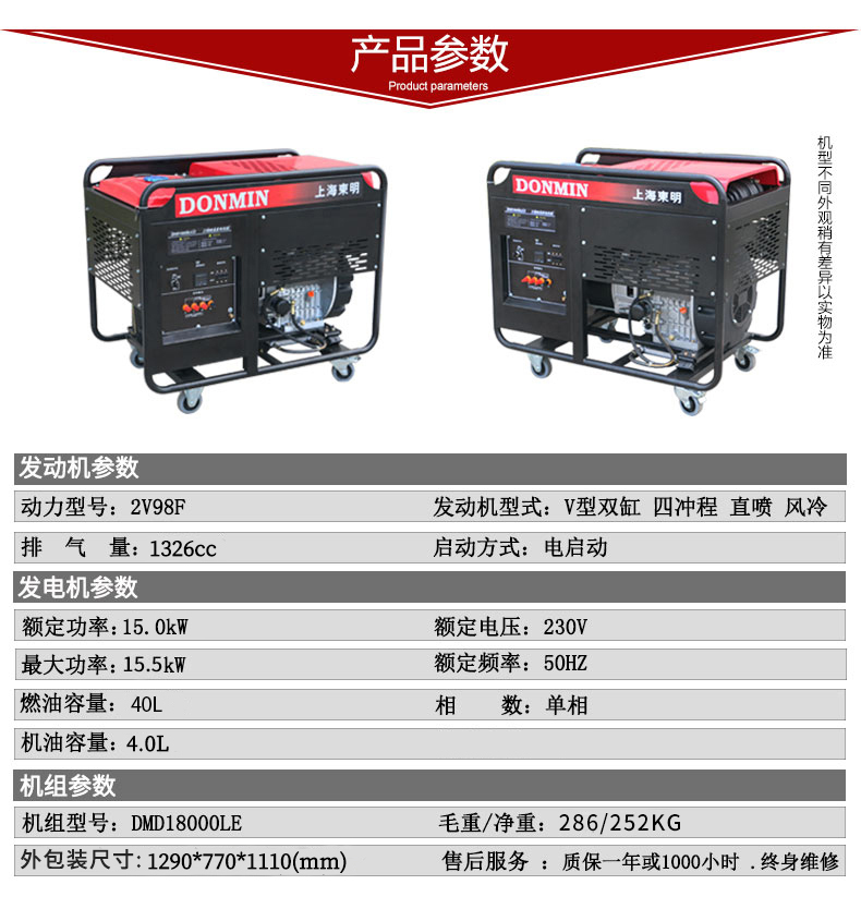 - 上海東明單相12KW 12000W柴油發電機組DMD15000LE ◆采用雙缸V型結構,動力強勁; ◆大型消音器,動平衡轉軸,低噪音機組設計,采用具有減震功能的外殼與框架; ◆大容量油箱確保長時間的連續工作; ◆無熔絲斷路器提供過載保護,電容電壓調節器,確保穩定電壓輸出; ◆定向輪加萬向輪結構,移動方便。